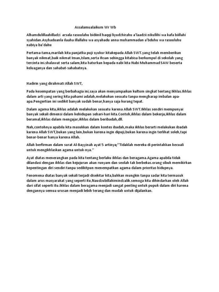 Hal ini merupakan amalan khusus yang diberikan untuk allah swt. Dalam agama islam ikhlas berarti melakukan sesuatu karena allah swt. Sesuatu baik berwujud materi atau non materi kepada . Demikian, materi singkat yang dapat saya sampaikan, semoga allah memberi kemudahan kepada kita untuk selalu menjalankan sholat dengan baik . Tulisan contoh ceramah ini hanya bersifat acuan atau panduan, dalam prakteknya materi bisa dikembangkan secara mandiri sesuai dengan konteks dan situasi yang .